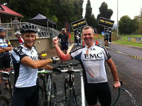 I mentioned the single track yesterday and it more than lived up to expectations. Sections of up to 3km interspersed with a bit of forestry road. And lots of variety – along the river, up and down through bluegum forests and pine plantations, each with there own character. Sometimes slippery in the drizzle and sometimes dry. Watch out for those roots – especially in the turns. No mishaps though apart from Jayson trying to rip a blackberry bush out of the ground as the thorns hooked and held on to his upper arm! Quite impressive the amount of blood dripping down at the end, so he had to fight off the medic protesting that it was only scratches and that he didn’t need her ministrations. I think she was disappointed.