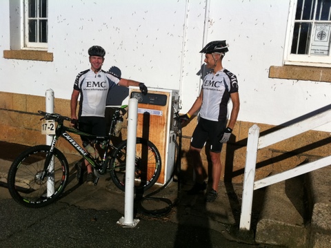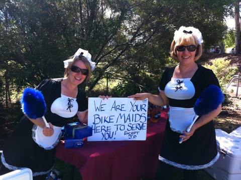 Exiting the MTB park, we flew past the waterpoint, slowing only to have our derriere’s dusted off by the French maids who were there to service us (their words not mine!). No jokes – the ladies had all donned French maid outfits complete with blue fluffy dusters! Who could refuse a light dusting?!