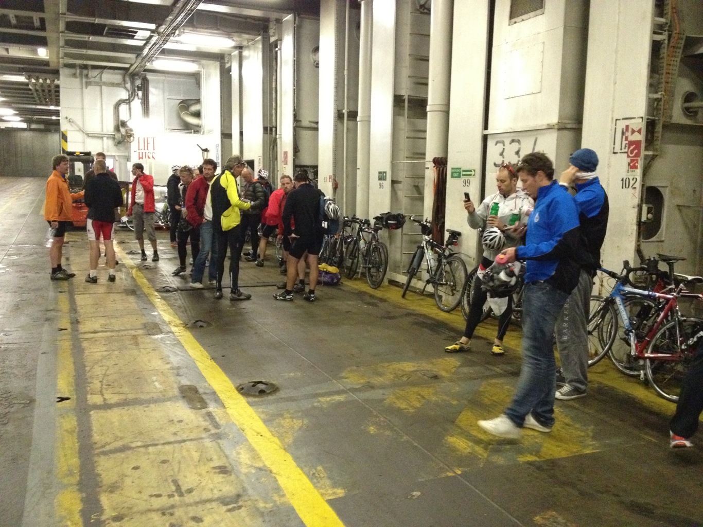 It felt strange to pedal the bike on board across the truck loading gangway competing with huge 18 wheelers. Once on board we stowed the bikes on the truck deck too. Well, stowed is a generous description – propped against the wall (bulkhead) is a better description.