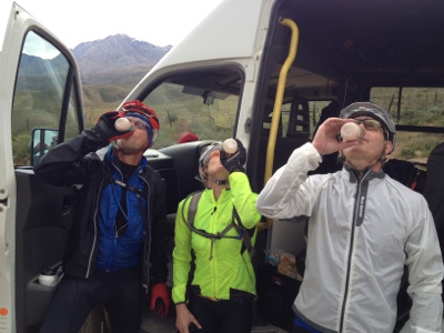Being up ahead we only connected with the vehicle once at 45km so we had a few logistical challenges. Mainly Rob and Colin ran low on water. Colin had 2 full bottles from where where we did meet the bus, but almost drained them within 35km making him quite worried about the next 35! Rob also had water issues. In fact Rob had a few issues today, including the lack of downhill and tailwind, once suggesting that the little climbs were like naughty children – they just wouldn’t stop.