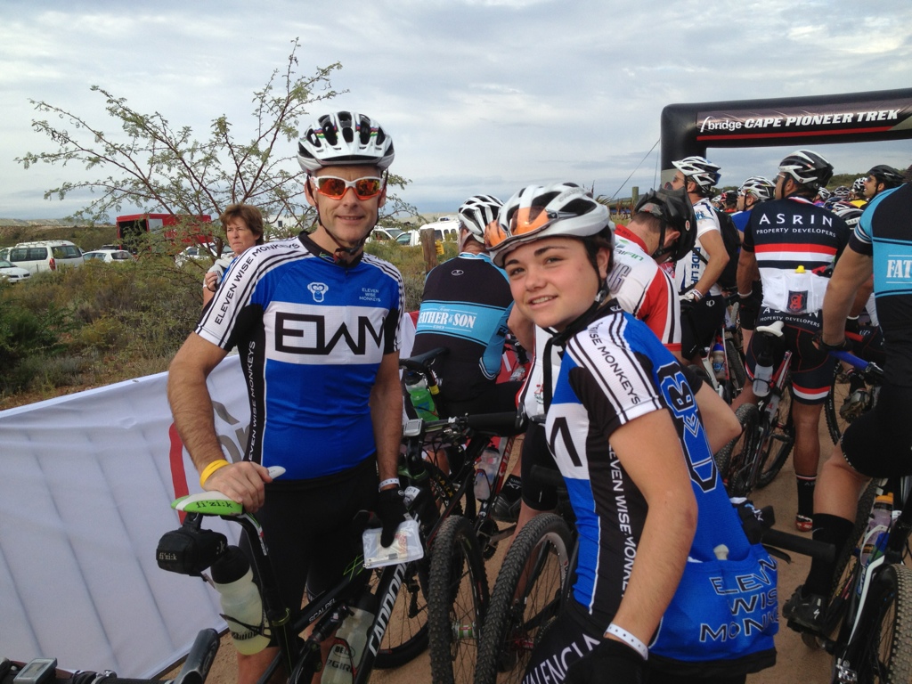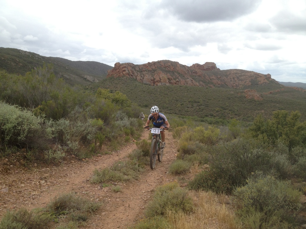 About 2 hours and a couple of Marmite sandwiches at Water Point 2 saw a recovery of sorts and we rode more strongly. The terrain became quite rocky – of the kind that slashes tyres. Once again Emily demonstrated her superior descending in those conditions Watching her bike from the back was quite something – bouncing and whipping in a way that makes one wonder how it stays upright. But we made it.