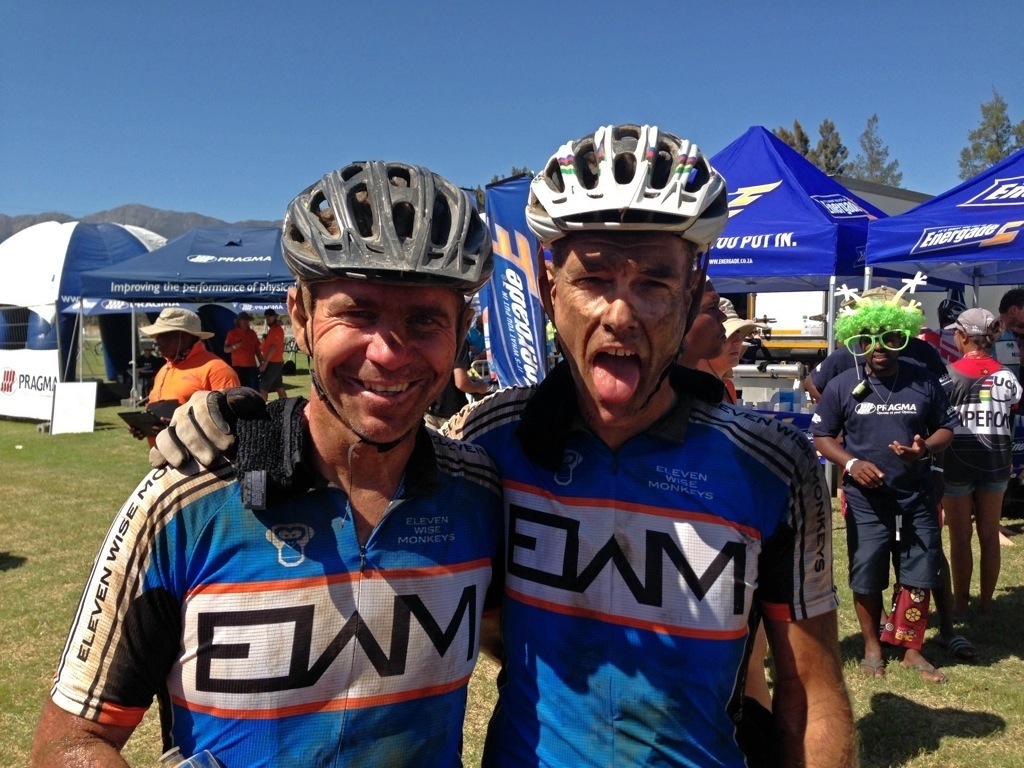 Stage 1 was a loop around Citrusdal. Fortuntely it had been shortened to “only” 96km as the last climb had been ravaged by a recent bush fire in the area. On the first rough rocky descent lost my rear water bottle. Pretty much a calamity. Fortunately Jayson was able to stop and retrieve it, stuffing it into a his jersey pocket. The twist was that not much further down, Jayson noticed his front water bottle cage had come adrift and was hanging on by just one bolt. So out came his bottle and was stuffed into the other side jersey pocket. If you knew how small these pockets are, you would know that it was quite a feat to complete the descent and not lose the bottles yet again!